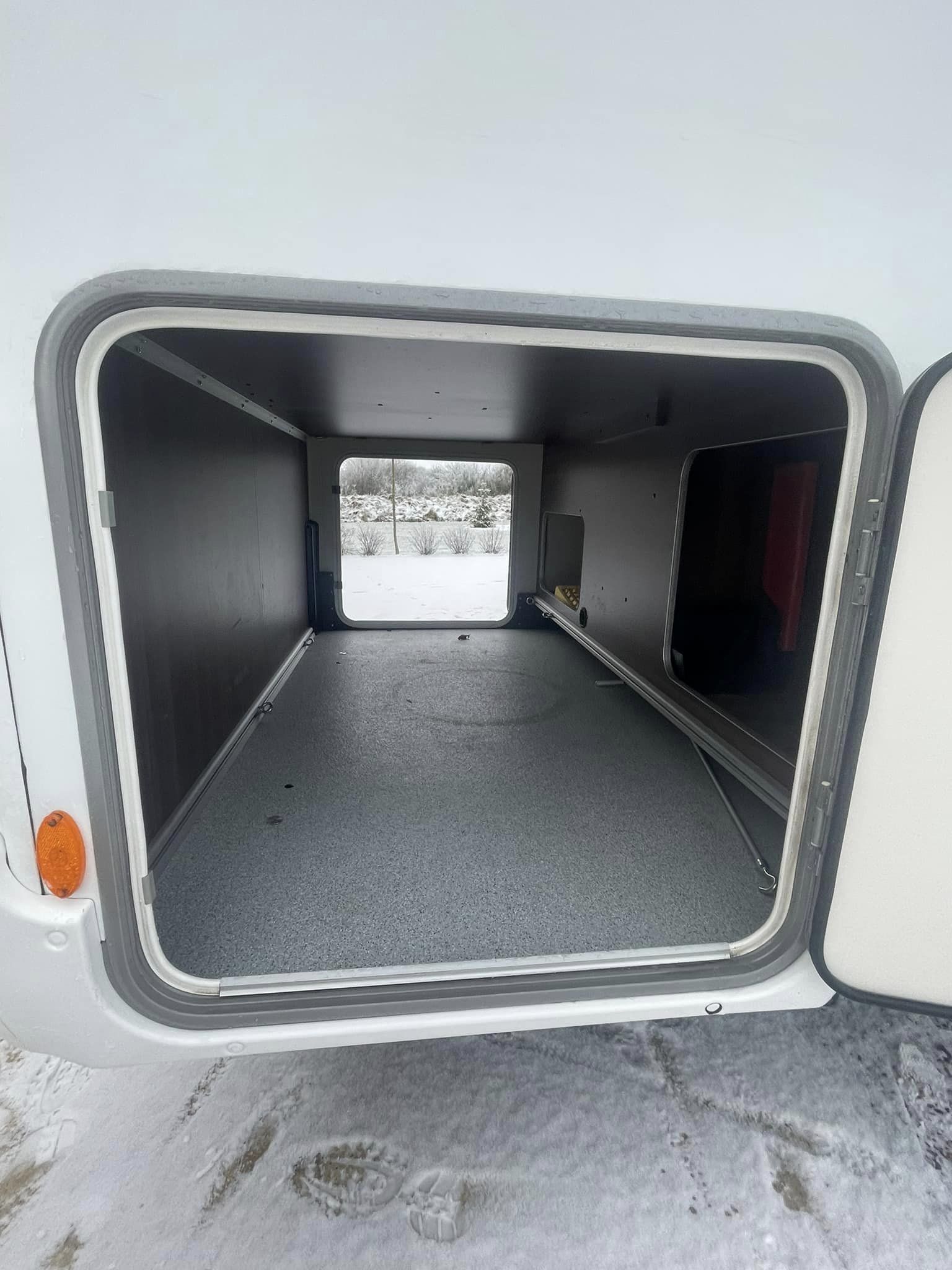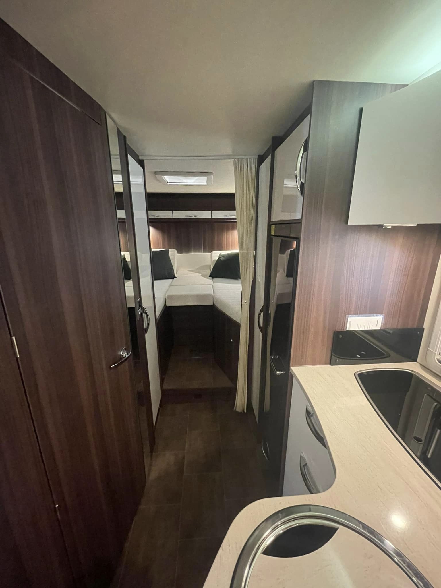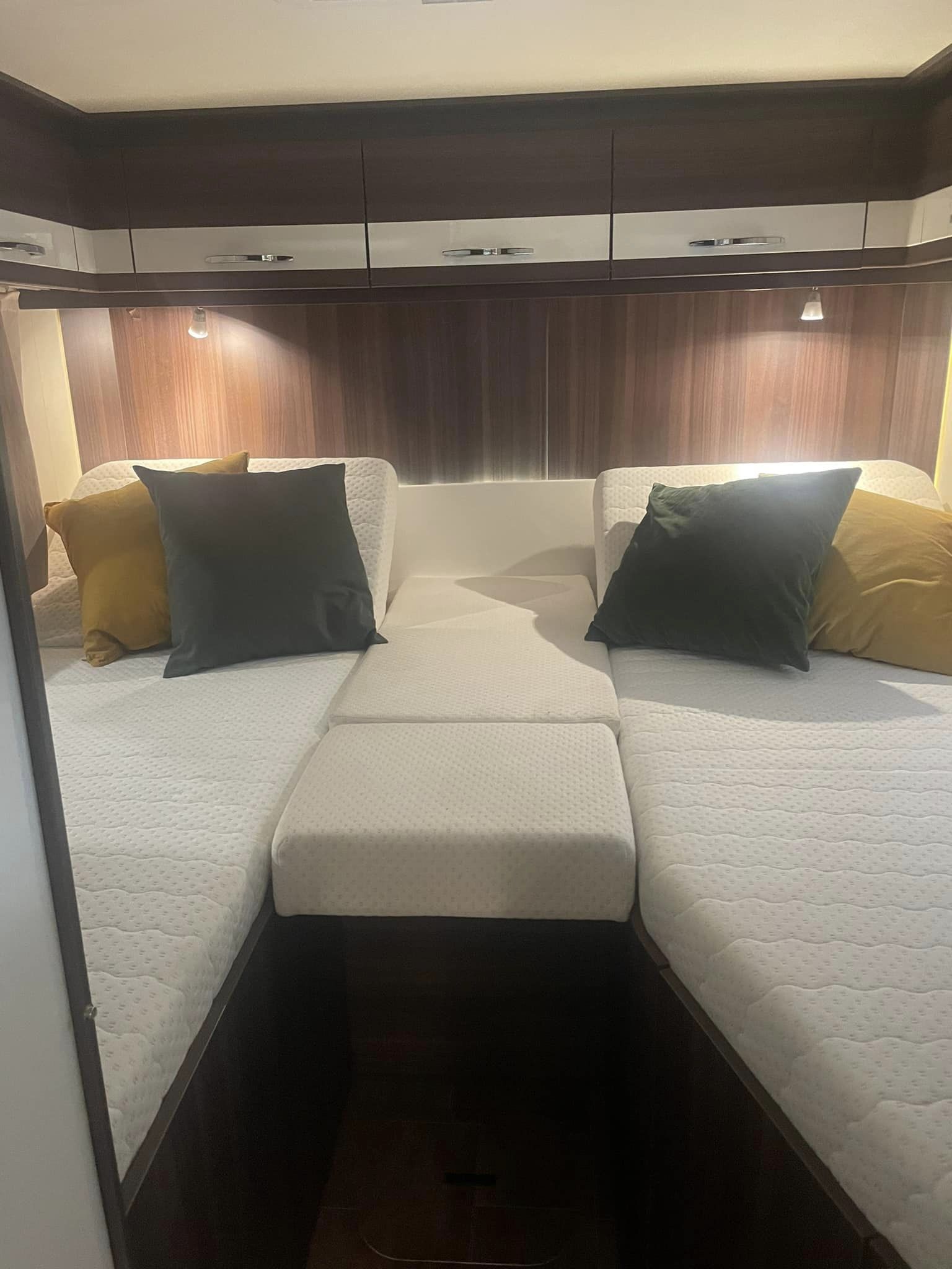Camperen indrettet med enkeltsenge i bag der ikke er så høje. Efterfulgt af 2 stk høje garderobe skabe hvor den ene er med bøjlestang, bruseniche toilet og vask