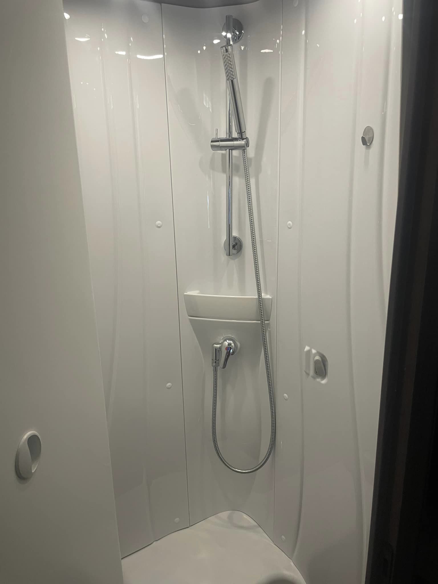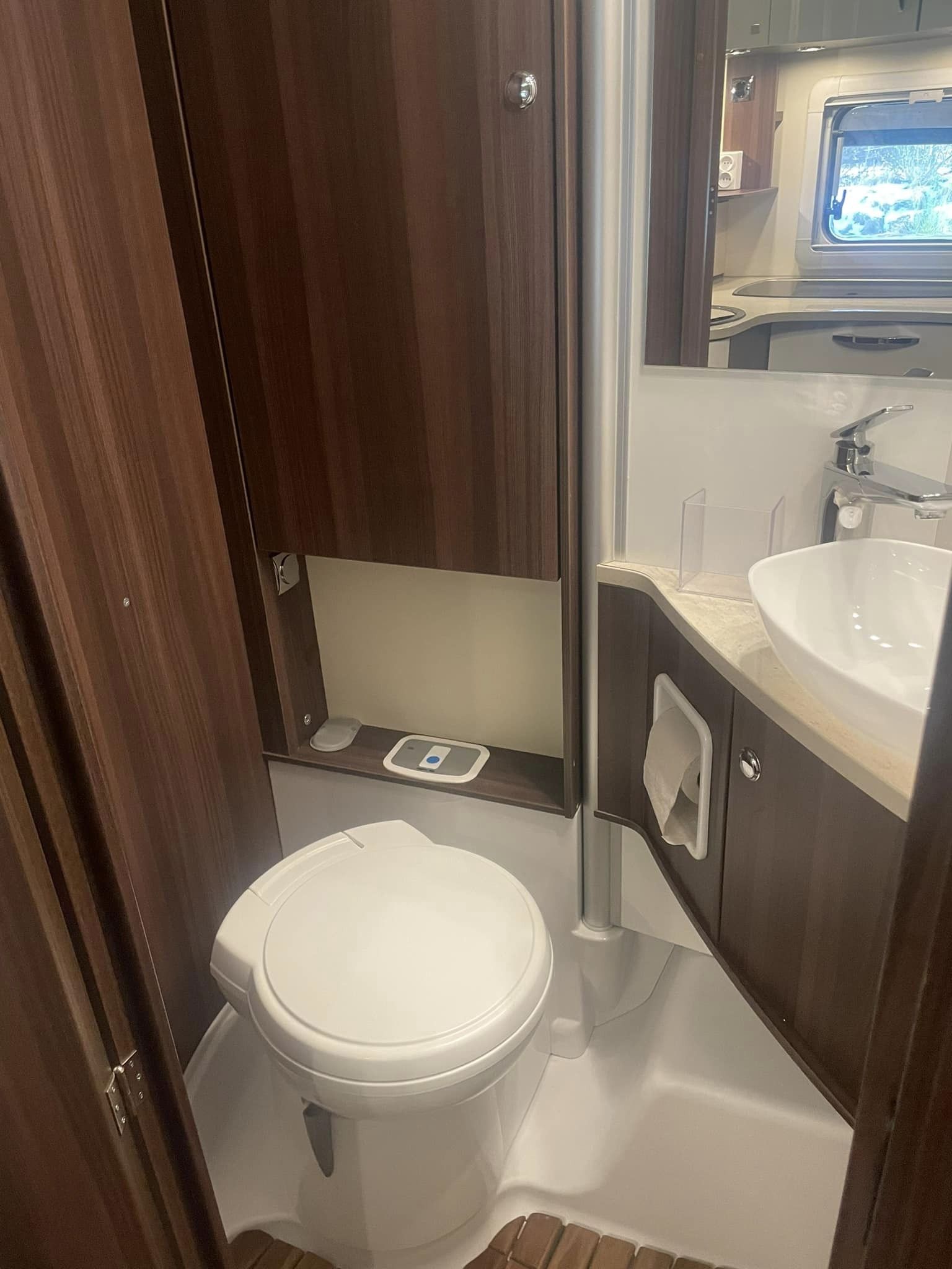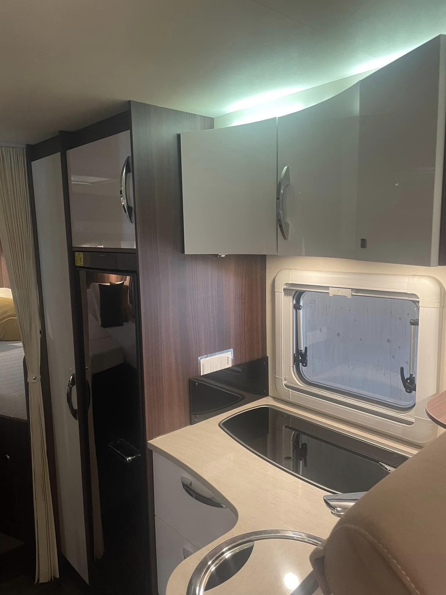Camperen indrettet med enkeltsenge i bag der ikke er så høje. Efterfulgt af 2 stk høje garderobe skabe hvor den ene er med bøjlestang, bruseniche toilet og vask
